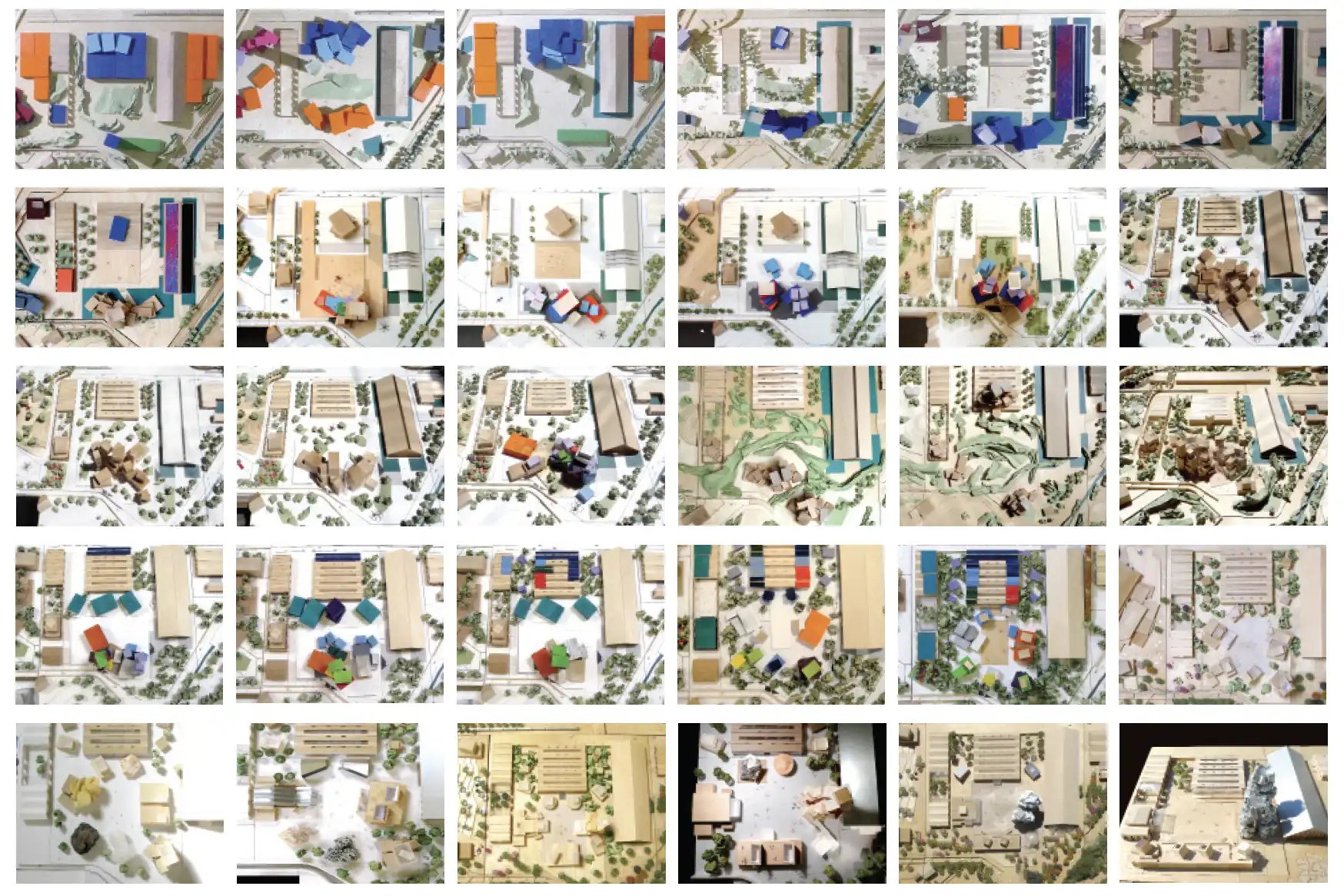 Models of the future Parc des Ateliers, illustrating the collective discussions held with Frank Gehry and the various development options considered for the site’s design.