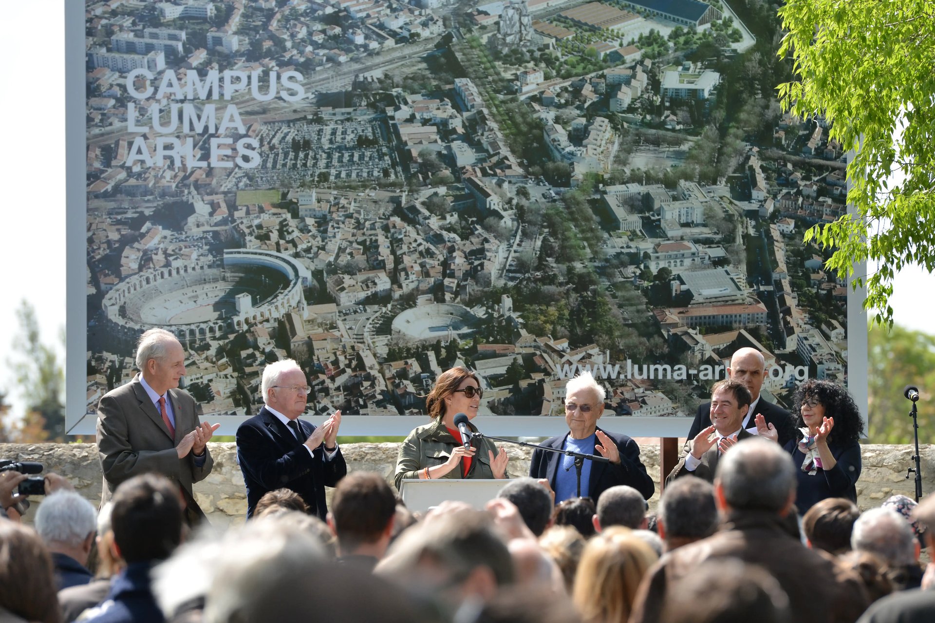 Groundbreaking ceremony for The Tower, attended by Frank Gehry, Maja Hoffmann, the mayor of Arles, and local officials.