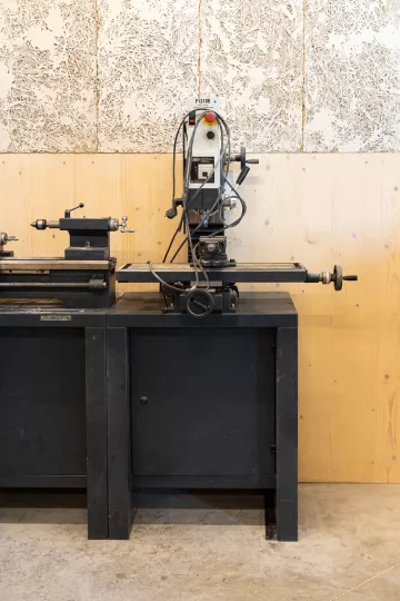Polyvalent, il est équipé de postes de soudure TIG, MIG et ARC, d’une CNC 4 axes pour un usinage précis de divers matériaux, d’un tour dédié au façonnage métallique, d’une fraiseuse à colonne pour des perçages précis ainsi que d’une gamme d’outils électroportatifs pour les finitions. Cet ensemble de machines permet la réalisation de pièces complètes, d’objets et de moules.