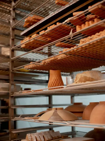 Au sein de cet espace, Atelier LUMA a développé divers éléments constructifs à base de terre crue et de chaux, formulé des pâtes argileuses et des émaux, conçu une gamme de vaisselle, ainsi qu'une collection prototype de céramiques architecturales.