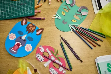 Entre mythologie, masques étonnants et animaux imaginaires, les enfants trouveront l’inspiration pour décorer et personnaliser un masque en carton avec différentes matières et textures pour donner vie à un être fantastique.
